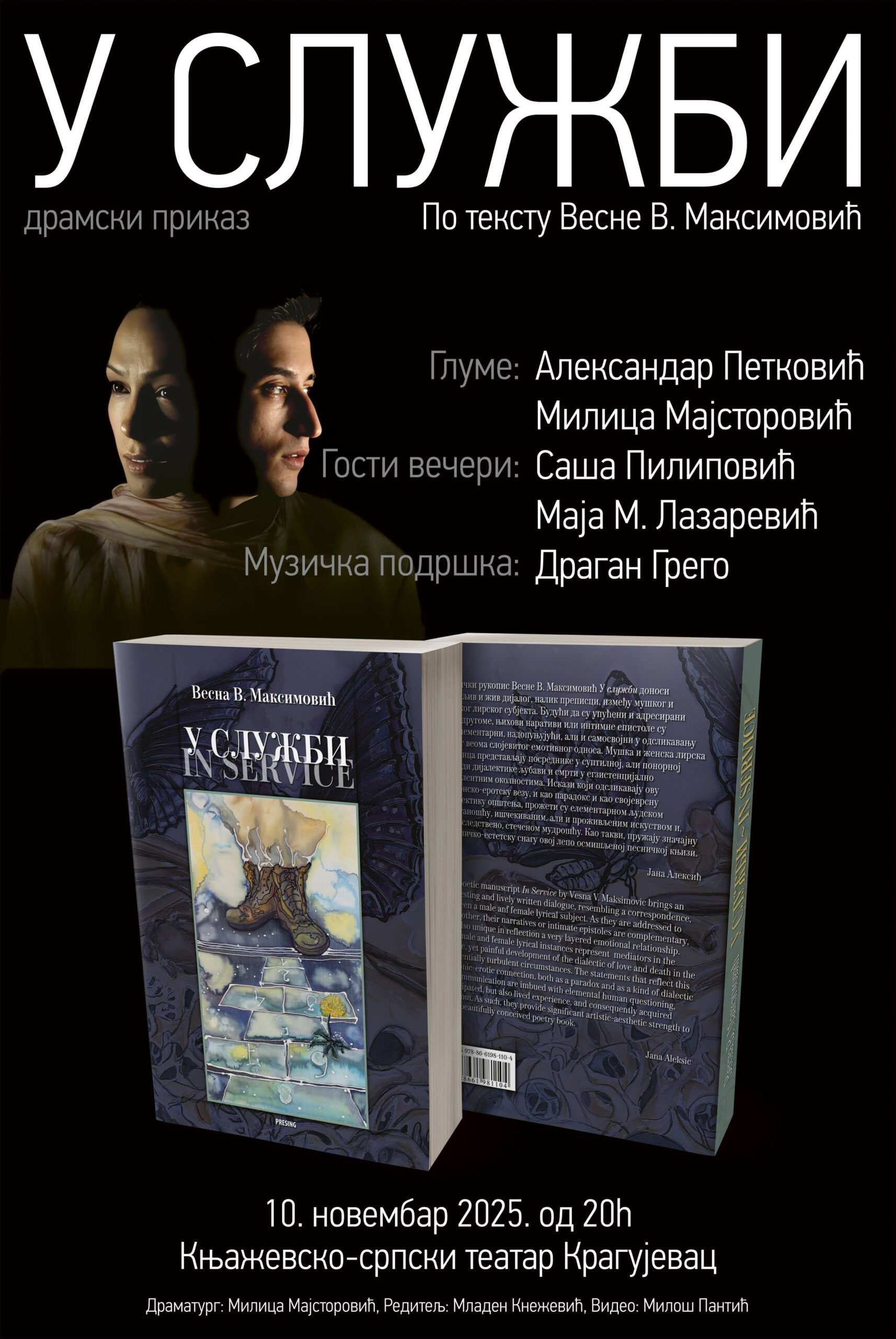 Na velikoj sceni Knjaževsko-srpskog teatra u Kragujevcu, u ponedeljak 10. novembra 2025. godine, biće premijerno izveden dramski prikaz „U službi“, rađen po istoimenoj dvojezičnoj šestoj knjizi pesnikinje Vesne V. Maksimović, izdatoj ove godine. Početak predstave je u 20 časova, a ulaz je slobodan.