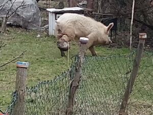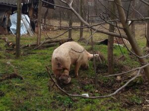 Njegovo dvorište je prekopano, okolne bašte su uništene.. Svinja danju traži hranu kako zna i ume. Noću se zavlači gde stigne, uglavnom u napuštena dvorišta, i tu spava.